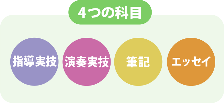 模擬レッスンや演奏、筆記・エッセイの試験を通して、 自身の指導を多角的に振り返ることができます。